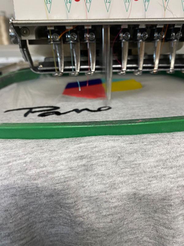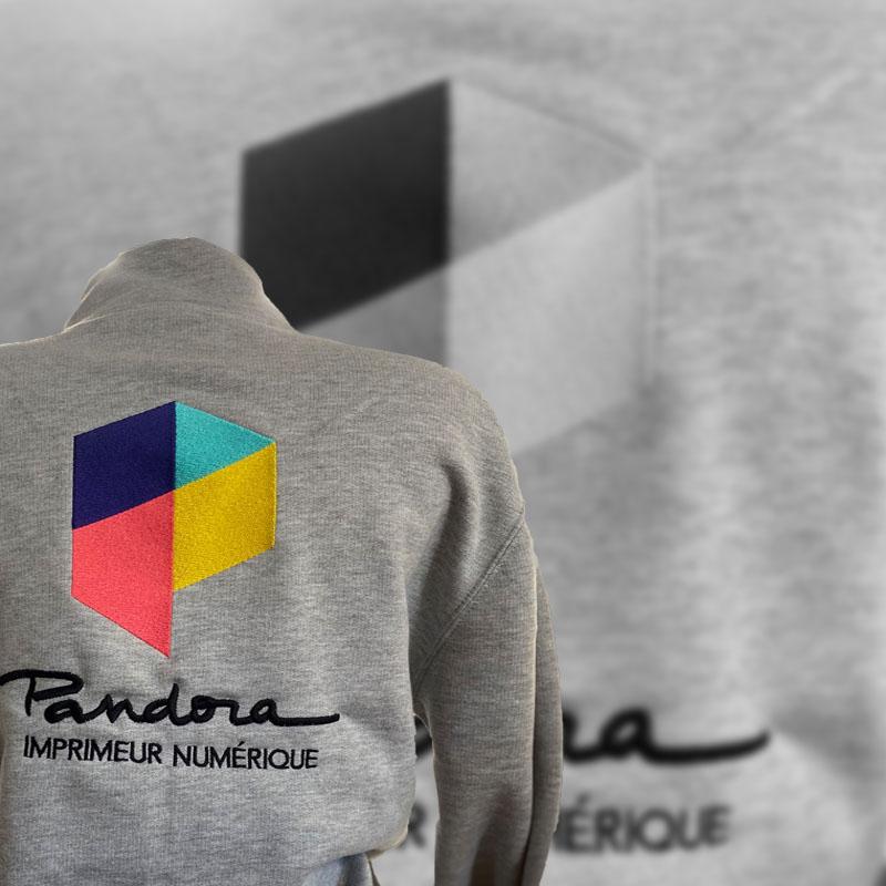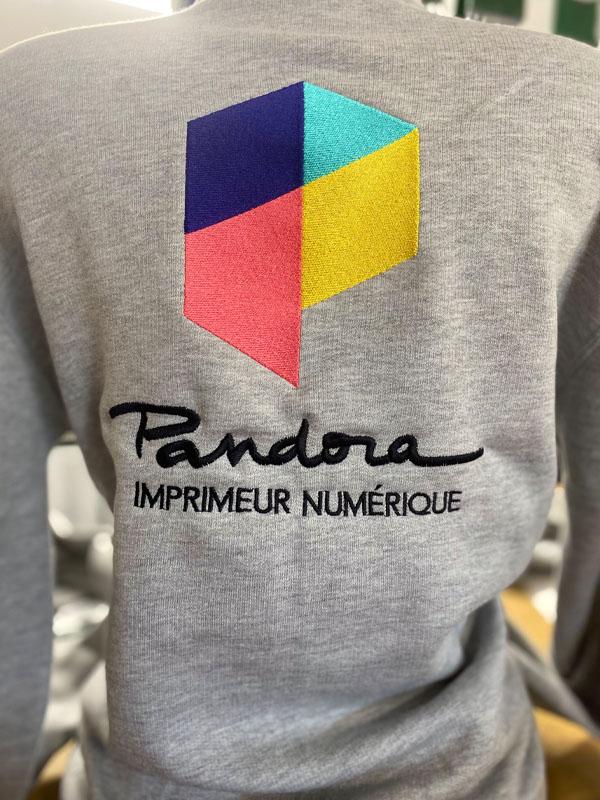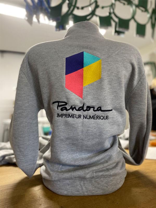 Réalisation sur un pull zippé gris de chez B&C Collection, pour Pandora.